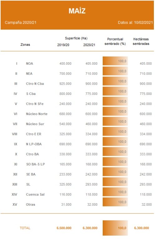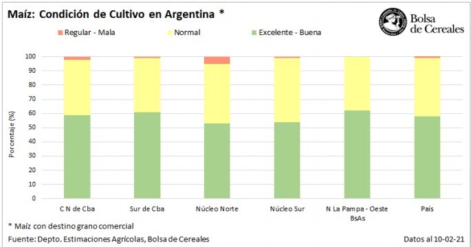 Desde nuestro informe previo, las temperaturas máximas moderadas y las lluvias relevadas durante febrero mantienen el estado del cultivo. Las labores de cosecha se concentran en las provincias de Entre Ríos y Santa Fe sobre lotes tempranos. Los rindes recolectados se encuentran por debajo de las expectativas iniciales producto del déficit hídrico registrado durante el período crítico. La estimación de producción de maíz con destino grano comercial para la campaña 2020/21 se mantiene en 46.000.000 Tn, 5,5 MTn menos que el ciclo previo (Producción campaña 2019/20: 51,5 MTn).