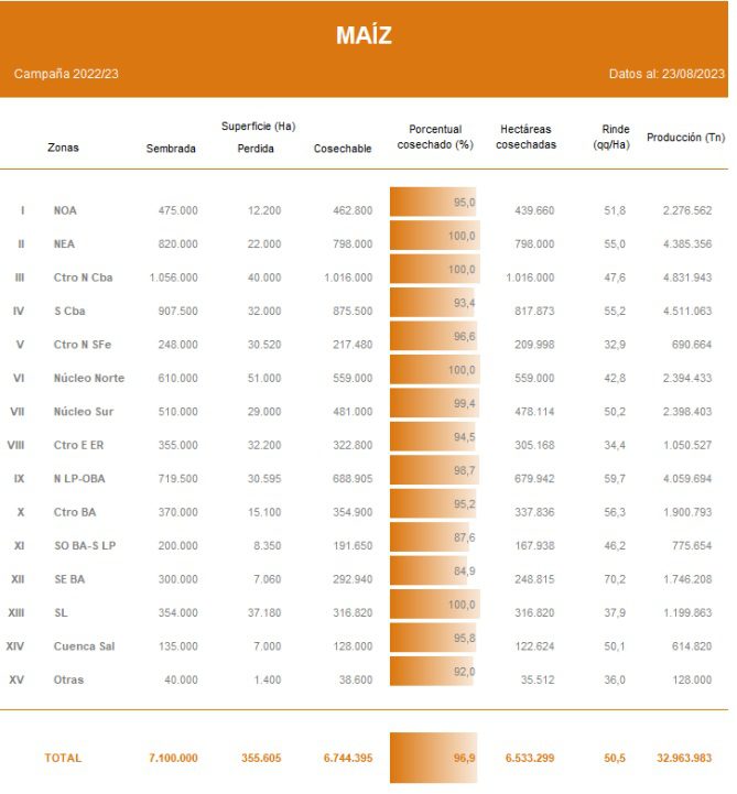 Durante la última semana la cosecha de maíz grano comercial mantuvo buen ritmo, dando por finalizada las labores de recolección del cereal de verano en el NEA, Centro-Norte de Córdoba, Núcleo Norte y San Luis. A la fecha, luego de un progreso intersemanal de 6,7 puntos porcentuales, se logró cosechar el 96,9 % del total de maíz estimado a nivel nacional para la campaña 2022/23. Esto significa un retraso respecto del promedio de las últimas cinco campañas de 2,4 p.p. El rendimiento medio se estima en torno a los 50,5 qq/Ha. En este contexto, mantenemos nuestra proyección de producción en 34 MTn, unas 18 MTn menos que la campaña anterior.
