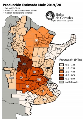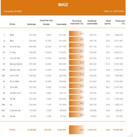 La cosecha de maíz con destino grano comercial cubre el 94,6 % del área apta en todo el país. El progreso intersemanal fue de 4,2 puntos porcentuales, permitiendo acumular una producción parcial de 47,6 MTn. El bajo nivel de humedad en los granos permite mantener un adelanto en la recolección de 26 pp. en comparación a la campaña. Las labores se concentran sobre los lotes sembrados durante el verano en el norte del país. El rinde medio nacional a la fecha se ubica en 82,3 qq/Ha. Bajo este escenario, se mantiene la proyección de producción de 50 MTn.