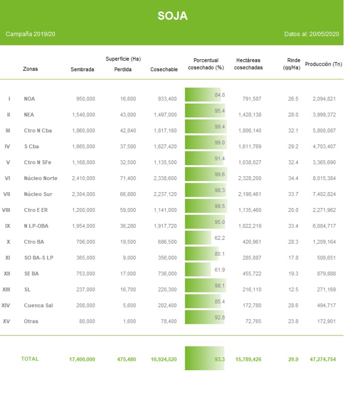 En paralelo, aún restan por recolectar 820 mHa correspondientes a siembras de segunda, en su gran mayoría ubicadas en la región bonaerense. En esta modalidad de siembra si se registran mermas importantes de rinde en zonas claves como el Núcleo Norte y el Núcleo Sur. Ambas zonas fueron afectadas por déficit hídrico en plena etapa crítica del cultivo. En paralelo, en las regiones NOA, NEA, Centro-Norte de Córdoba, Centro-Norte de Santa Fe, Norte de La Pampa y Oeste y Centro de Buenos Aires, los rendimientos medios se ubican por encima a los promedios de las últimas cinco campañas.
