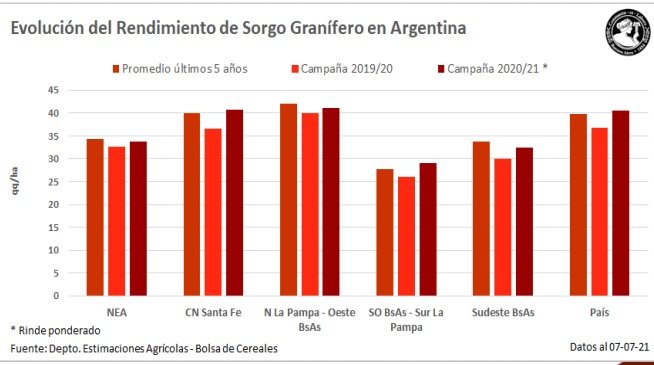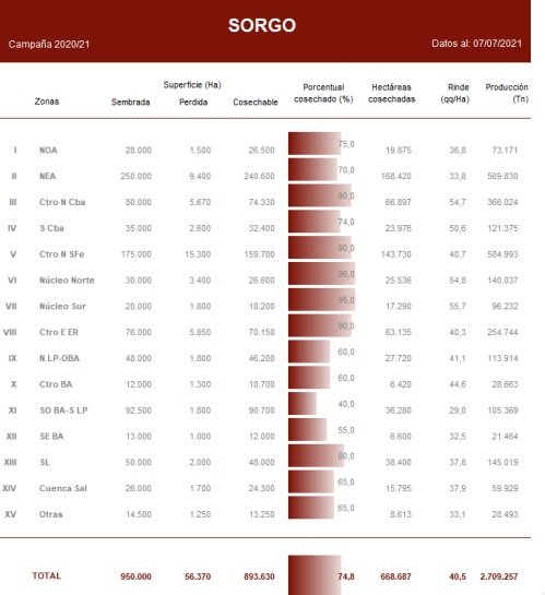Con un progreso interquincenal de 7,3 puntos, el avance de cosecha de sorgo granifero alcanza a cubrir el 74,8 % de la superficie apta. Favorables condiciones climáticas permitieron la recolección de los cuadros sobre el extremo norte del área agrícola, con el NOA informando un progreso de 20 puntos a lo largo de los últimos quince días. Rendimientos por encima de los esperados sobre el centro del área agrícola, elevan la producción acumulada a 2,7 MTn. Frente a este panorama, mantenemos la actual estimación de producción nacional en 3,3 MTn, 800 mTn más que las recolectadas la campaña previa (Producción ciclo 2019/20: 2,5 MTn).
