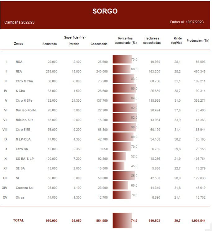 Durante los últimos quince días, la cosecha del cereal de verano tuvo un progreso de 10,2 puntos porcentuales, que, traducido a superficie, significan unas 82 mHa. Hasta el momento ya fueron cosechadas 640.000 Ha de sorgo a nivel nacional, con un rinde promedio de 29,7 qq/Ha.