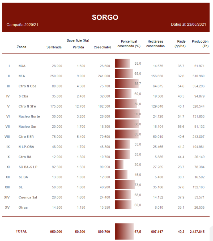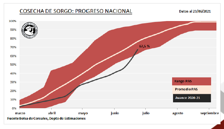 El fin de la cosecha de soja y las favorables condiciones climáticas de los últimos quince días destraban la cosecha del cereal. Luego de un avance interquincenal de 21,8 puntos, el 67,5 % de la superficie apta de sorgo ha sido recolectada. Los mayores progresos se relevaron sobre el NEA, el Centro-Norte de Córdoba y ambos núcleos informando un avance promedio de 27 puntos.