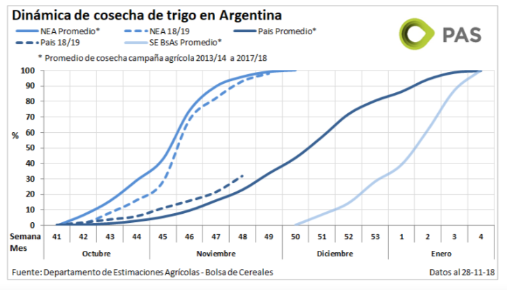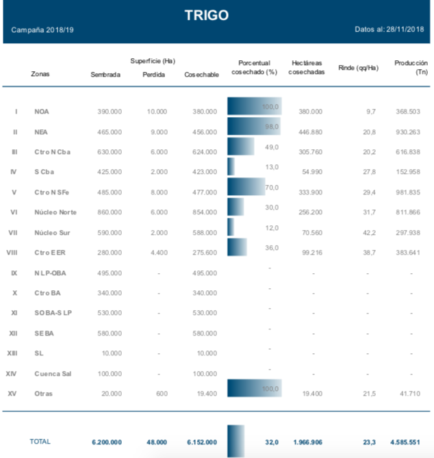 La cosecha de trigo continúa avanzando a buen ritmo sobre las regiones del centro y norte del área agrícola nacional. La recolección alcanzó el 32 % de la superficie apta, con un rendimiento medio nacional de 23,3 qq/Ha y un volumen acumulado de 4,58 millones de toneladas. A pesar de las últimas heladas registradas, gran parte de la provincia de Buenos Aires mantiene una condición de cultivo entre buena y excelente, la cual permite mantener la proyección de producción en 19.200.000 millones de toneladas.