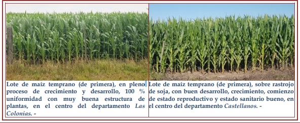 Dicha realidad del cultivo fue consecuencia de las condiciones ambientales que acompañaron desde el inicio hasta la fecha a los cultivares implantados, planes de fertilización concretados, material genético utilizado y el ¿ manejo de los lotes. Se remarca la particularidad, que en la totalidad del área de influencia de las cuencas lecheras, continuó observándose un muy buen estado de los maizales, mostrando que el sector realizó una importante inversión. El estado sanitario detectado fue bueno, sin manifestaciones de ataques de enfermadades ni de plagas. Se observaron los siguientes estados fenológicos: V “estados vegetativos”, V3 (3º hoja desarrollada), V4 (4º hoja desarrollada), V5 (5º hoja desarrollada), V6 (6º hoja desarrollada), V7 (7º hoja desarrollada), V8 (8º hoja desarrollada), V9 (9º hoja desarrollada), V10 (10º hoja desarrollada), Vt (panojamiento), R “estados reproductivos”, R1 (emergencia de estigma) y lotes puntuales más avanzados en R2 (cuaje – ampolla).