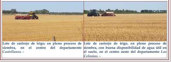 Con la liberación de un importante porcentaje de superficie con rastrojos de trigo, con una muy buena humedad en la cama de siembra, fue intenso el ritmo de siembra de soja tardía, permitiendo un buen a óptimo proceso. A posteriori del mismo, las aplicaciones de herbicidas para control de malezas fue el común denominador de las secuencias de las actividades realizadas. Hasta la fecha se logró un grado de avance del 25 % de la intención de siembra, aproximadamente se concretaron unas 137.500 ha de las 550.000 ha previstas inicialmente. Se observaron, los siguientes estados fenológicos: V “estados vegetativos”, VE (emergencia), Vc (estado de cotiledón, hojas unifoliadas pegadas), V1 (1º nudo), y en lotes más avanzados en V2 (2º nudo).