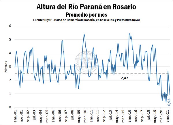 En los 22 meses que pasaron desde agosto de 2019 un solo mes, en febrero 2021, la altura promedio del Río Paraná en Rosario superó la marca de 2,47 metros, el mínimo que exige por contrato Hidrovía S.A. para mantener la obligación de asegurar los 34 pies de calado. En este marco, se estima hoy un calado efectivo de 31 pies, que genera una pérdida de capacidad de carga de entre 4.500 y 5.500 toneladas por cada buque que se despacha desde la región, aproximadamente un 10% de su capacidad total.