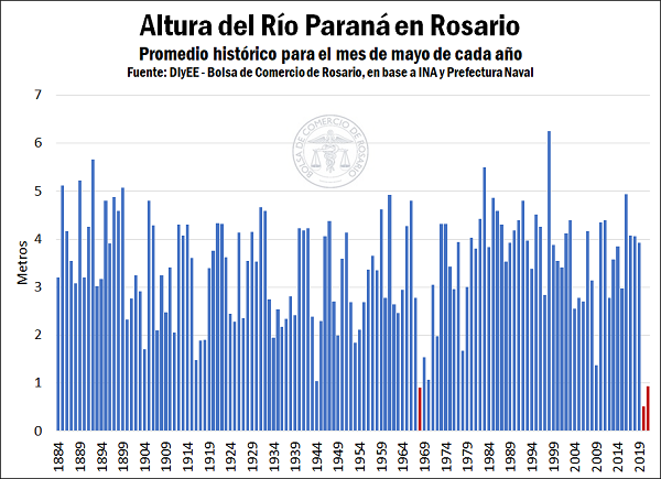 Con registros que datan del año 1884 a la fecha, la altura promedio del Río Paraná para el mes de mayo sólo 3 veces en la historia estuvo por debajo del metro: en mayo de 1968 (0,91 m) y luego ya en mayo 2020 (0,51 m) y los primeros seis días de mayo del 2021 con 0,93 m de promedio. Ello resalta la gravedad histórica de los registros observados a la fecha. Con problemas que se acumulan desde el año pasado, las lluvias del verano en la cuenca de los ríos que alimentan la Hidrovía y que incluyen el sur de Brasil no fueron suficientes para revertir el panorama en el 2021.