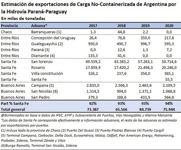 Las dificultades para embarcar en el nodo sur santafesino cobran particular importancia a la luz de la contribución que realiza a los embarques totales nacionales y la importancia estratégica de la Hidrovía Paraná-Paraguay para la vinculación comercial de Argentina con el mundo. En efecto, en el año 2020 los despachos de carga no-containerizada por este medio ascendió a 76 millones de toneladas, tal como muestra el cuadro adjunto. De este total, la provincia de Santa Fe aportó en el año 2020 el 94% de las cargas, o 71,3 millones de toneladas, siendo por lejos la contribuyente líder en los embarques de la Hidrovía Paraná-Paraguay. Además, a participación de la provincia en el total continúa creciendo desde el año 2017 ganando desde entonces 2 puntos porcentuales.