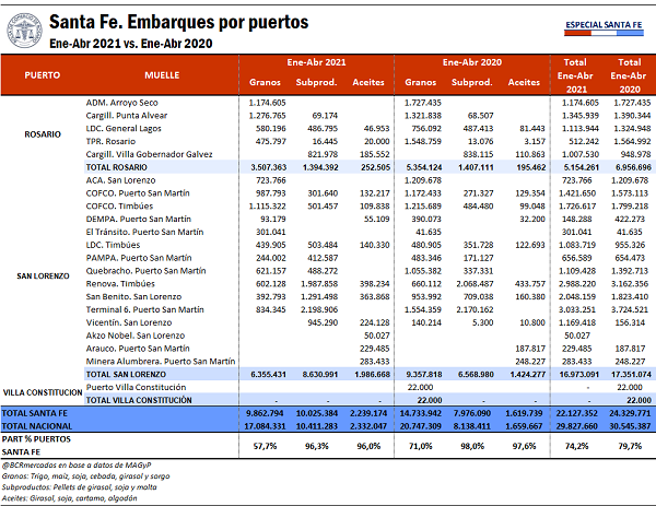 Si se centra la mirada específicamente en los embarques de granos, subproductos y aceites desde los principales puertos del Gran Rosario, en el primer cuatrimestre de 2021 se despacharon 22,1 Mt en contraste a las 24,3 Mt alcanzada en el mismo período de 2020.