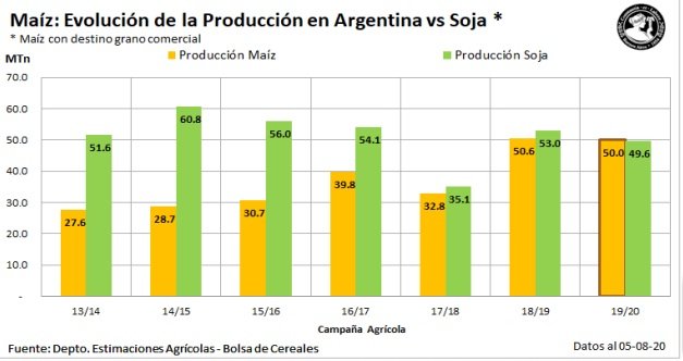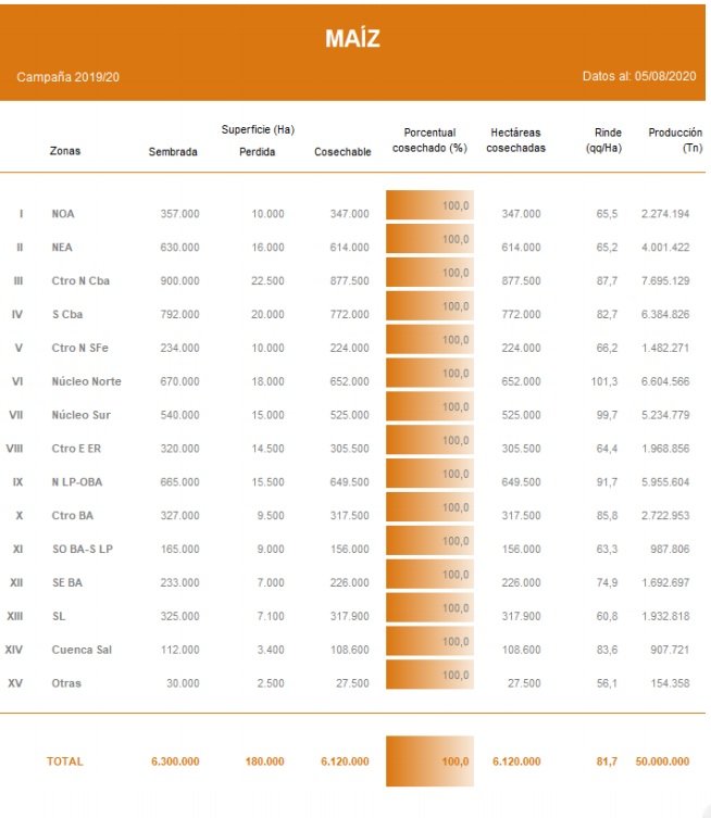 La recolección de maíz con destino grano comercial llegó a su fin en toda el área agrícola nacional. El presente ciclo culmina con una producción de 50 MTn, superando en volumen a la cosecha de soja por primera vez en toda la serie PAS. Luego de registrar un progreso intersemanal de 2,6 puntos porcentuales, se lograron cosechar 6,12 MHa durante la campaña 2019/20. Las labores culminaron con un adelanto interanual de 19,8 pp. En cuanto a las pérdidas, las mismas ascendieron a 180.000 Ha en todo el país. El rinde medio nacional se ubicó en 81,7 qq/Ha, por debajo del valor de la campaña previa (Rinde campaña 2018/19: 83,1 qq/Ha).