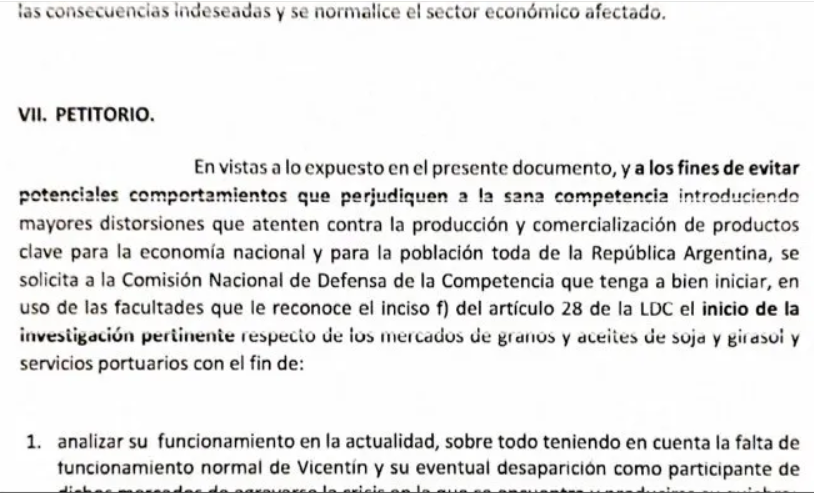 En ese sentido agrega que la actual falta de funcionamiento de la cerealera o su eventual desaparición de producirse su quiebra “solo tiene efectos negativos y altamente nocivos para los mercados en los que participa. Los mercados de granos y aceites de soja y girasol se convertirán en mercado mucho más concentrados de lo que lo están hoy si Vicentin no vuelve a producir con normalidad o desaparece en el futuro”.