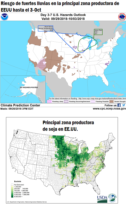 En el caso de la soja, el avance de la cosecha en Estados Unidos asciende al 9%, según reportó su Departamento de Agricultura (USDA). Ello supone una mejora respecto al 6% recolectado para la misma altura del año anterior, aunque la probabilidad de ver lluvias por encima de lo normal en plena zafra despierta nerviosismo en el mercado. A las lluvias que recibió esta última semana el Medio Oeste estadounidense se le suma la alerta de su servicio meteorológico oficial por fuertes lluvias en los próximos siete días, lo cual podría entorpecer la cosecha americana. El mapa a continuación contrapone el área donde se prevén intensas precipitaciones (la línea verde en el mapa de arriba) con las regiones más importantes de producción de la oleaginosa (en el mapa de abajo). Para el maíz no sólo coincide la principal región productiva en torno a los Grandes Lagos, sino que se le adiciona el leve retraso que ya muestran las labores de trilla, que han avanzado un 10% a la fecha, por detrás del 11% registrado a la misma altura del año anterior.
