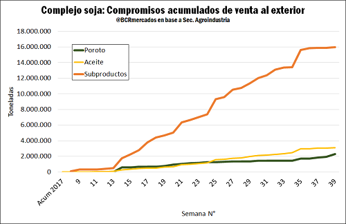 Al mismo tiempo, las declaraciones juradas de venta al exterior que informa la Secretaría de Agroindustria dan cuenta de una álgida semana de negocios. En efecto, las más de 350.000 toneladas de poroto de soja comprometidas en los últimos siete días representan la semana de mayor volumen negociado en el mercado de exportación en casi un semestre, a las que se le suman ventas al exterior de aceite de soja por casi 40.000 toneladas más 93.000 toneladas de subproductos