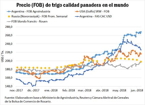 Los precios de trigo registrados en la Bolsa de Comercio de Rosario, que continuaron su tendencia bajista, disminuyeron fuertemente respecto a la semana anterior en el segmento disponible medido en dólares. El precio de pizarra de la Cámara Arbitral de Cereales aumentó de $ 5.880 /t el jueves 7 de junio a $ 6.000 /t el día jueves 14. Sin embargo, en dólares el precio disminuyó de 236 USD /t el día jueves 7 a 217,4 /t el día jueves 14, más de 21 USD /t. Si contamos desde el jueves 31 de mayo, el precio viene cayendo 26 USD y más de 40 USD desde el máximo alcanzado al 15 de mayo de este año. El volumen negociado en la semana, en el segmento disponible, también disminuyó respecto a lo negociado en la semana anterior. Según datos oficiales, lo negociado entre el viernes 8 y el jueves 14 con entrega inmediata fue casi nulo, de 420 toneladas. El volumen comercializado para entrega en el mes de junio fue de 3 mil toneladas mientras que lo negociado para entrega contractual en julio y agosto fue de 22,5 y 14 mil toneladas respectivamente. El tonelaje operado en estos segmentos fue un 50 % menor a la semana anterior. Esta situación se vio reflejada en el piso de operaciones de la Bolsa de Comercio donde fueron muy pocos los compradores dispuestos a realizar negociaciones contra estas posiciones. Comparando con los precios FOB locales, que permanecieron incólumes, el precio local por el trigo disponible tuvo una baja importante.