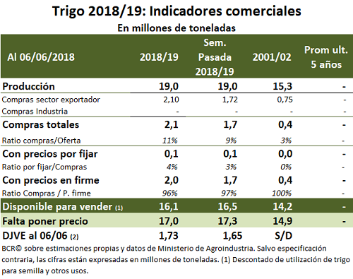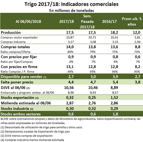 La caída en el precio del trigo se da luego de conocerse robustos indicadores de comercialización que marcan al 6 de junio un 80 % de la cosecha de trigo comercializada. Tomando en cuenta la diferencia entre las DJVE 17/18 del sector exportador y las compras declaradas, más, las compras menos lo procesado por el sector molinero, al 6 de junio ambos sectores detentarían solamente inventarios por 600 mil toneladas. Esto es, siempre teniendo en cuenta los compromisos asumidos por el sector exportador (DJVE) de 10,56 Mt. Si tomamos a la fecha los embarques estimados de 8,96 Mt. (Dic hasta el 06 de Junio, no se contabiliza lo exportado en noviembre que podría proceder de la cosecha 17/18 de trigo) el stock remanente de ambos sectores alcanza 2,23 Mt.