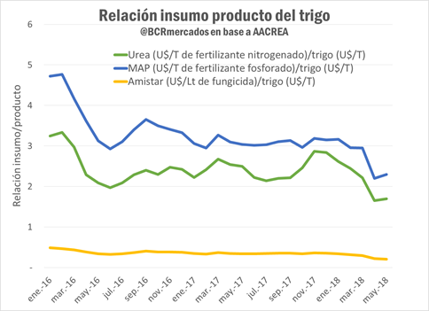 En el siguiente gráfico se muestra como la relación del precio de algunos principales insumos para la producción con respecto al precio del trigo disminuyó considerablemente desde fines del año del 2017.