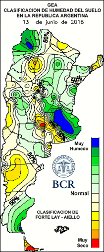 Respecto a la humedad para la siembra de trigo, en el siguiente mapa se percibe una marcada diferencia entre el este y oeste del país. El norte de Buenos Aires presenta condiciones de excesos de humedad mientras que, parte Córdoba, oeste de Buenos Aires y La Pampa, las reservas se tornan deficientes. Pese a esto, los ciclos largos se están sembrando y muchos productores comenzaron con la implantación de los ciclos intermedios.