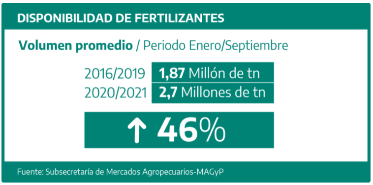 El Ministerio de Agricultura, Ganadería y Pesca de la Nación, destacó que al mes de septiembre Argentina tiene 2,87 millones de toneladas de los seis principales fertilizantes (urea, UAN, DAP, MAP, superfosfato y roca fosfórica). Este volumen se traduce en un nivel 13% superior al del año pasado para la misma fecha, 19% mayor que en 2019, 52% más que en 2018, 101% más que en 2017 y 74% más que en 2016.