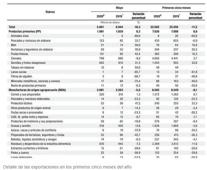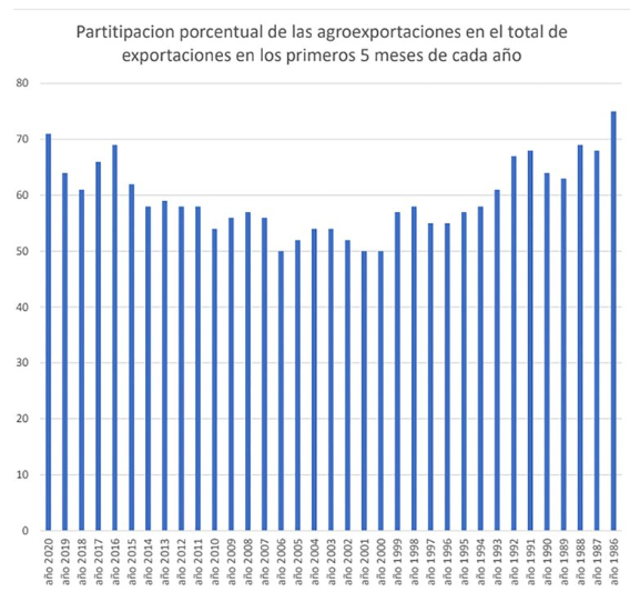 En los primeros 5 meses del año, el porcentaje de la agroexportación sobre las ventas totales fue el más alto desde 1986 y la colocación de productos industriales la más baja desde 1991.