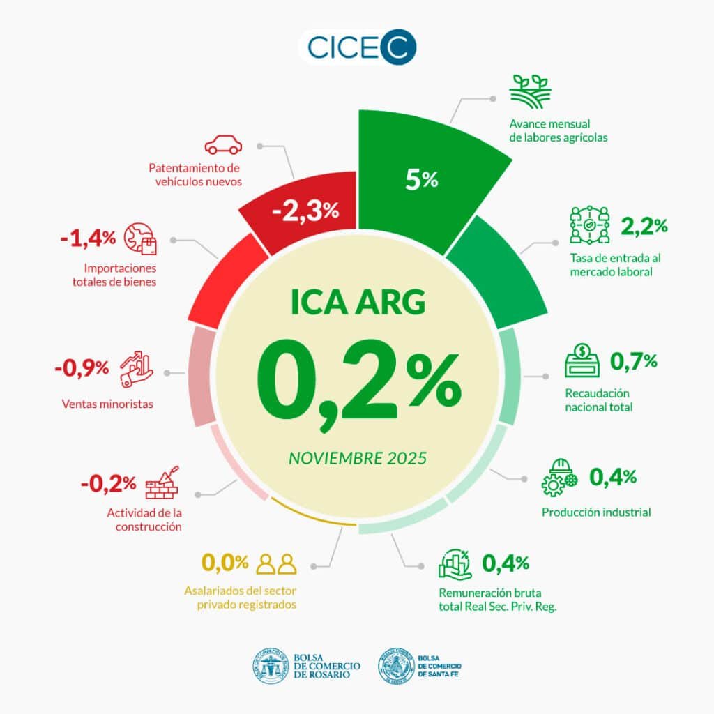 Según el último informe del Índice Compuesto Coincidente de Actividad Económica (ICA-ARG), elaborado por la Bolsa de Comercio de Rosario y la Bolsa de Comercio de Santa Fe, la economía de Argentina creció un 0,2 % mensual en noviembre. El dato confirma una recuperación incipiente tras la fase contractiva que se extendió entre marzo y septiembre.