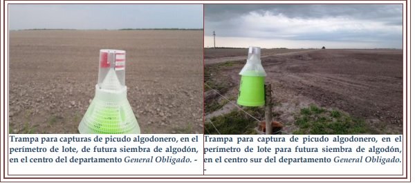 A una semana del inicio de la siembra en la zona este provincial, se monitorearon las trampas en los predios destinados a algodón y continuó la prevención del ingreso del picudo al lote, realizándose las aplicaciones en los bordes, en caso de necesidad. La Secretaría Nacional de Sanidad Vegetal (SENASA) estableció como fecha obligatoria de siembra, los siguientes períodos: desde el 1 de octubre al 15 de noviembre, para la zona este de la provincia de Santa Fe y del 1 de noviembre al 15 de diciembre, para la zona oeste de la provincia.