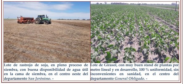 El proceso de siembra en el área centro norte santafesina logró un grado de avance del orden del 85 %, un incremento intersemanal de 10 puntos y un retraso de 10 puntos en comparación con la campaña del año anterior, para similar período. Lo implantado continuó evidenciando muy buena germinación y emergencia, con muy buen comienzo y desarrollo de las plantas, bajo condiciones ambientales ideales, así como también óptima disponibilidad de agua útil en los suelos. Sin inconvenientes en cuanto al estado sanitario del cultivo, sin presencia de patógenos ni insectos. Se observaron los siguientes estados fenológicos: V “estados vegetativos”, VE (estado de cotiledón), V1 (1º par de hojas de más de 4 cm de largo) V3 (3º par de hojas verdaderas), V4 (4º par de hojas verdaderas), V5 (5º par de hojas verdaderas) y lotes más avanzados en bajo porcentaje en V6 (6º par de hojas verdaderas).