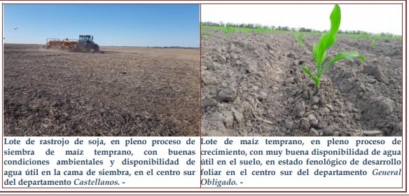 La estabilidad mencionada, permitió los movimientos de equipos y sembradoras del cultivo de girasol y de maíz temprano (de primera), en forma normal, progresando en los distintos departamentos, consolidando la marcha de la nueva campaña agrícola de cosecha gruesa. Las tareas efectuadas en la semana fueron: a) monitoreo y seguimiento de los cultivares de trigo, b) siembra de girasol, c) siembra de maíz temprano (de primera), d) monitoreo de trampas para capturas de picudos, en predios destinados al cultivo de algodón, e) aplicación de herbicidas y preparación de lotes para próximos cultivos.