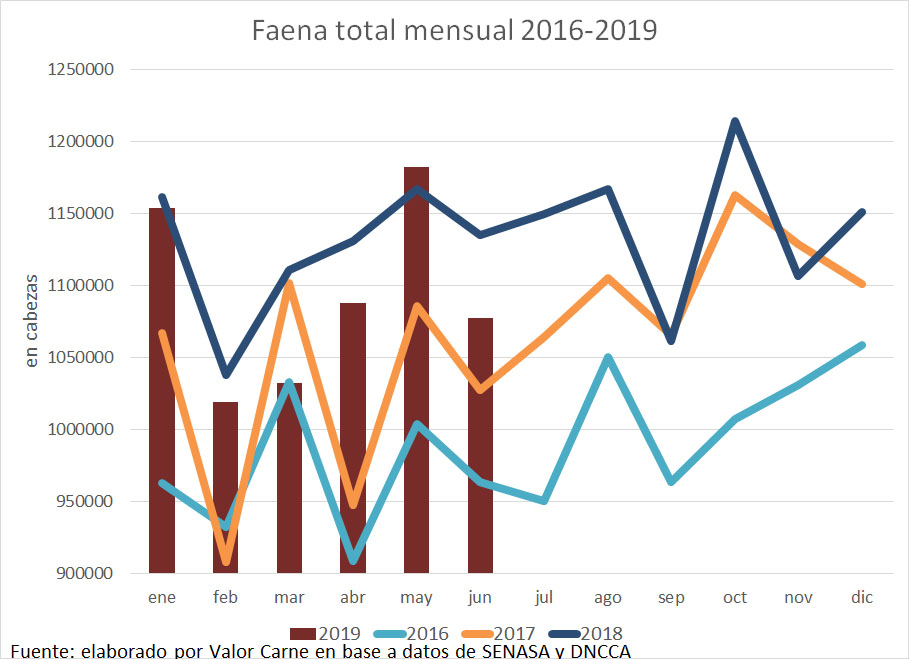A partir de mediados de 2017, la faena acumulada de 12 meses empezó a mostrar aumentos interanuales que llegaron a un pico de +10% en junio de 2018. A partir de ahí, ese crecimiento de 12 meses comenzó a ceder, sin prisa pero sin pausa, hasta llegar a cero en junio pasado.