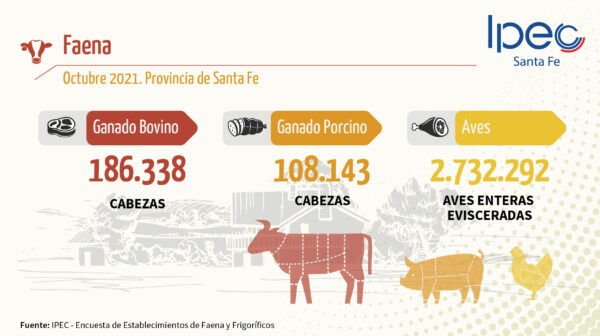 La faena de ganado porcino en Santa Fe correspondiente a octubre de 2021 tuvo una variación negativa de 6,2% en relación al mes anterior y una variación positiva de 1,1% respecto a octubre de 2020. Las cabezas faenadas en el periodo de referencia ascienden a 108.143.