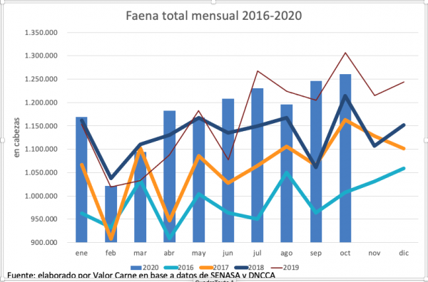 Se trata del cuarto mes de este año con reducción frente al mismo mes de 2019. No obstante, la faena media diaria superó en 6% la de septiembre pasado y la de octubre de 2019.