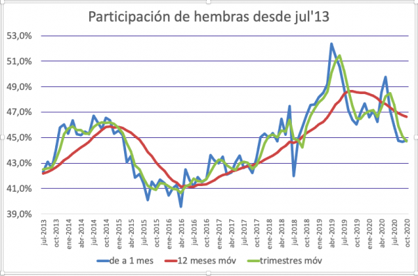 Octubre fue el tercer mes consecutivo en que la participación de hembras se ubica en el acotado segmento de 44,7-44,8%, habiendo caído desde casi el 50% de mayo o, inclusive, desde más del 52% de abril de 2019. Desde principios de 2018 que no se veía un porcentaje tan bajo.