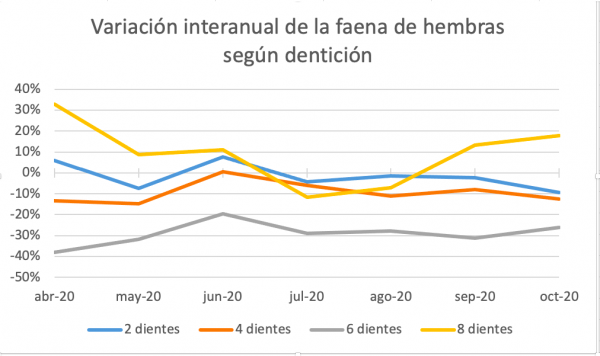 En octubre se profundizaron las tendencias de reducción de la faena de hembras de dos y de cuatro dientes mientras que sigue aumentando la de ocho dientes, lo que estaría hablando de una mayor limpieza de vacas adultas.