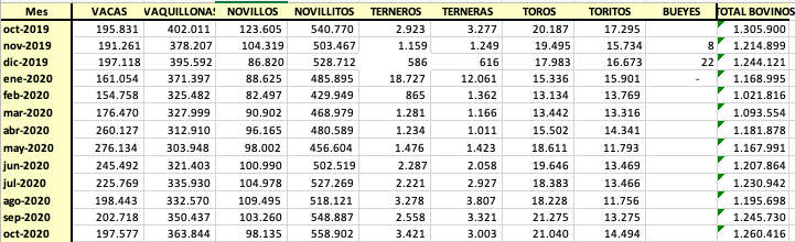 En el caso de los machos, que impulsaron el crecimiento de la faena total durante un año, desde agosto de 2019, ya llevan varios meses de aumentos cada vez menores y, en octubre, pasaron a los números negativos, por primera vez desde julio de 2019.