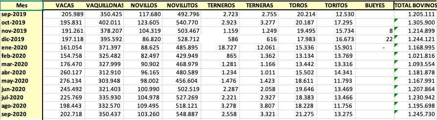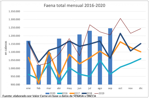 En septiembre se faenaron 1,25 millones cabezas, 4% más que en agosto y 3% más que en septiembre de 2019.