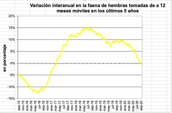 Otro elemento a destacar en septiembre es que, siguiendo la faena de vientres de 12 meses seguidos, es la primera vez en tres años y medio que dejó de crecer en relación al año anterior, como se ve en el gráfico siguiente.