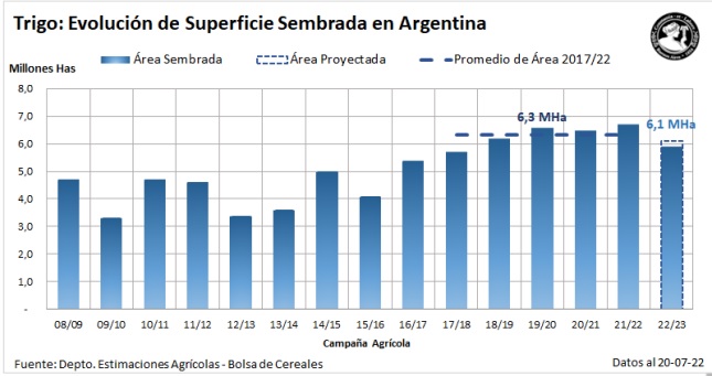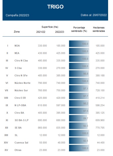 La proyección de siembra para el ciclo en curso vuelve a caer 100.000 hectáreas, ubicándose en 6,1 MHa (Reducción interanual: -9 %). La reducción de superficie se concentra en el centro del área agrícola, donde las lluvias del pasado fin de semana no fueron suficientes para revertir el escenario de limitada oferta hídrica previo al cierre de la ventana de siembra. Actualmente ya se sembró el 96,8 %, que en términos absolutos representa algo más de 5,9 MHa. Las heladas registradas durante las últimas semanas continúan demorando el crecimiento inicial y provocando daños en tejidos de lotes tempranos