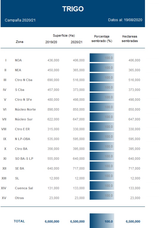 Luego de un progreso semanal de 0,3 puntos porcentuales, la siembra cubrió el 100 % de las 6,5 MHa proyectadas para la campaña 2020/21. Las heladas comprometen el estado de los cuadros más avanzados