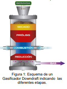 El flujo de material es vertical descendente, ingresando el mismo por la zona superior del reactor a través de compuertas con sellos herméticos. Debido a la alta temperatura la biomasa tiene en la parte superior una primera etapa de secado. A medida que va descendiendo la biomasa atraviesa una zona de pirólisis (proceso en ausencia total de oxígeno) en donde comienzan las reacciones termoquímicas de transformación de biomasa, generándose también alquitranes y vapor de agua. Luego la biomasa pasa a la zona clave del reactor que se conoce como garganta, en la cual se produce la oxidación (combustión parcial) de la biomasa. Ésta es la zona de ingreso controlado de aire, que se hace mediante boquillas inyectoras. Por último el material ya transformado pasa por una zona de reducción donde termina el proceso de reducción de los gases generados en la etapa anterior, lográndose la composición final del gas de síntesis. En la figura 1 se puede ver un esquema de un gasificador downdraft, donde se muestran las distintas etapas.
