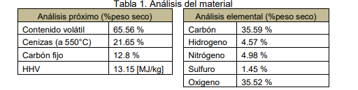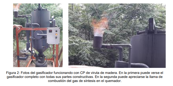 De acuerdo al tiempo de permanencia del material en cada etapa, el tamaño de las partículas se va reduciendo generando un flujo de gases combustibles, alquitranes y carbonilla residual. El material residual (10-11 % de biochar) que sale del gasificador está formado por fragmentos de diámetro reducido (su tamaño depende del tamaño de la biomasa ingresada) que puede ser utilizado como mejorador de suelos, además de un 2-3 % de cenizas y alquitrán. El material tanto sólido como gaseoso sale del gasificador con una elevada temperatura. El gas de síntesis generado es filtrado por un ciclón para retener partículas en suspensión y luego es quemado en un quemador para apreciar visualmente la llama. Las muestras de Cama de Pollo fueron tomadas de diferentes estibas (pilas) a campo, en el establecimiento de un contratista de la zona de Caseros, departamento Uruguay, Entre Ríos. Las camas poseían dos crianzas y alrededor de dos meses de estivadas a la intemperie. Una era CP de Viruta de madera de pino y eucalipto y la otra CP de cáscara de arroz. A los fines de bajar el nivel de humedad se pro-cedió a secar las muestras mediante estacionado bajo techo, obteniéndose los siguientes valores: