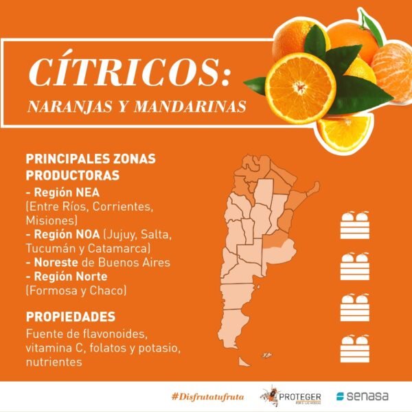 La citricultura es una de las actividades frutícolas más importantes de nuestro país, ya que presenta condiciones ecológicas ideales para el desarrollo de su cultivo y producción. El Servicio Nacional de Sanidad y Calidad Agroalimentaria (Senasa) realiza acciones para cuidar esta producción y alienta a que las personas consuman estos frutos de característico perfume y color.