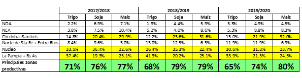 En el siguiente cuadro puede verse la proporción de aporte en volumen del país agrupando seis áreas diferentes, en base a datos informados por la Bolsa de Cereales de Buenos Aires. Se destacan las principales zonas productivas, que aportan más del 65-70% de la producción nacional.