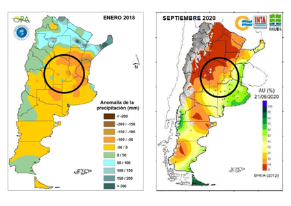 En los siguientes mapas pueden verse las anomalías de precipitaciones para enero 2018, a la izquierda, y el contenido de agua útil en el perfil de suelo a septiembre 2020 a la derecha.