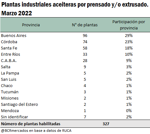 La provincia de Buenos Aires encabeza la lista en número con 96 plantas extrusoras, representando el 29% del total de plantas del país, seguido por Córdoba con 74 plantas y Santa Fe en tercera posición con 58 establecimientos. Es necesario aclarar que la información pública no distingue por tipo de oleaginosa que se industrializa, pudiendo incluir en esta lista algunas plantas de molienda de girasol o de alguna otra oleaginosa, pero la gran mayoría se destinan al crushing del grano más producido en el país.