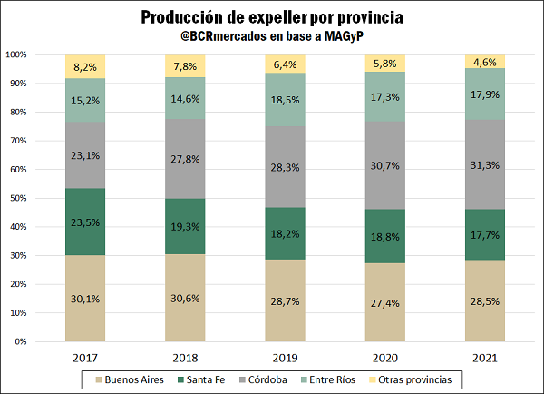 A la hora de analizar la distribución en la producción de expeller de soja, vemos que la principal provincia productora en el año 2021 fue Córdoba, concentrando un share del 31,3% del total producido, seguido por Buenos Aires con un 28,5% y Entre Ríos con un 17,9%. El crecimiento ha sido heterogéneo en los últimos 5 años, con las producciones de Córdoba y Entre Ríos creciendo más que proporcionalmente adquiriendo una mayor participación del mercado. Mientras que, la producción de Buenos Aires y Santa Fe han cedido posiciones, dado que estas provincias ostentaban el 1° y 2° lugar, respectivamente, en 2017. Esta distribución territorial contrasta fuertemente con la industria tradicional de molienda de soja, en la cual el 90% del crushing estuvo concentrado en la provincia de Santa Fe en el año 2021.