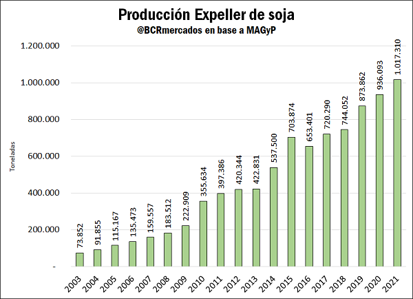 Evolución de la producción: en 2021 se superó por primera vez el millón de toneladas producidas de expeller