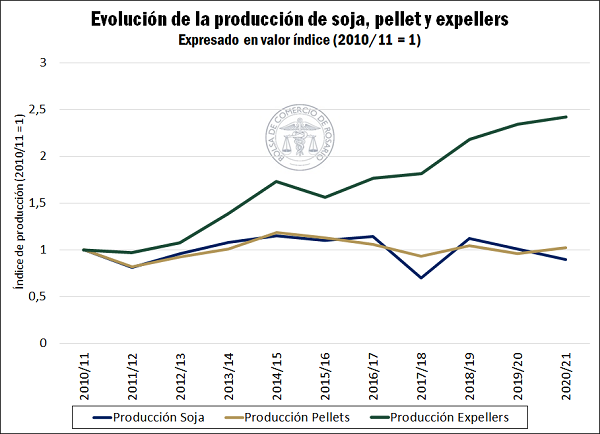 La evolución de la producción de soja en los últimos diez años ha mostrado una tendencia heterogénea en nuestro país, llegándose a alcanzar un récord productivo en la 2014/15, cuando se produjeron cerca de 57,7 millones de toneladas, para luego estancarse. Respecto a la tendencia productiva de pellets de soja siguió una evolución similar pero no idéntica, con la importación de soja desde países vecinos permitiendo la estabilización de la operatoria en tiempos de faltante de materia prima, cómo en la sequía de la campaña 2017/18. La producción de expeller, mientras tanto, ha continuado creciendo de forma constante en el período: en la campaña 2020/21 se produjo 2,4 veces el volumen que se producía 10 campañas atrás (140% de incremento), mientras que la producción de soja en Argentina es apenas 0,9 veces la producción de la campaña 2010/11 (caída del 10%), y la producción de pellets es prácticamente la misma (2% de aumento).
