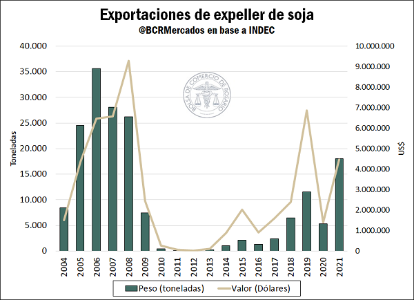 En el año 2021 las exportaciones de expeller alcanzaron un récord en volumen desde el año 2008, al exportarse un total de 18.025 toneladas, por un valor cercano a los US$ 4,4 millones. Esto significó un incremento del 238% en tonelaje y de un 222% en divisas en comparación con el año 2020. No obstante, el récord en exportaciones en términos del valor se alcanzó en el año 2008, cuando este sector generó ingresos por exportaciones de US$ 9,2 millones de dólares.