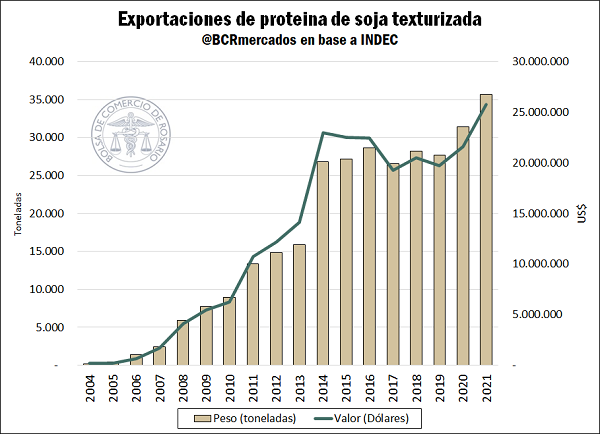 Las exportaciones de proteína de soja texturizada (PST) han presentado una tendencia creciente casi ininterrumpida a lo largo del tiempo, arribando a un récord de exportaciones en el año 2021 en nuestro país de 35.645 toneladas exportadas, por las que habría ingresado un total cercano a los US$ 25,7 millones.