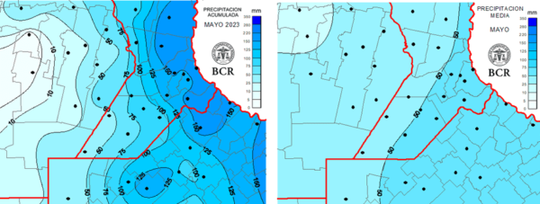 La región núcleo, al igual que la región pampeana, está partida por la mitad. En el este de la zona núcleo, por primera vez en más de doce meses, se alcanzó el estado óptimo de las reservas de agua en el suelo (para el primer metro). En el oeste faltan 80 mm. En el sudeste de Santa Fe y el noreste bonaerense, los registros mensuales duplican y hasta cuadruplican los valores normales estadísticos. Rosario acumuló 207 mm en mayo; Irigoyen, 171 mm; Pergamino, 160 mm; y Lincoln, 140 mm.  En el sudeste de Córdoba los acumulados mensuales no alcanzaron los valores estadísticos. Bell Ville registró 22 mm, Canals 14,5 mm y Hernando acumuló tan solo 1,5 mm en todo el mes.
